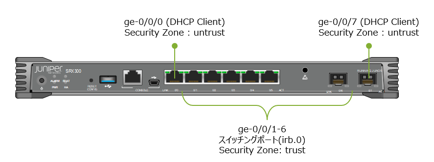 SRX300 の場合、デフォルト設定では ge-0/0/0, ge-0/0/7 が DHCP クライアントとして設定されており、ge-0/0/1-6 がスイッチングポートとなっています。これらのスイッチングポートでは irb.0 が 192.168.1.1/24 のアドレスを持っており、DHCP サーバーとして動作します。