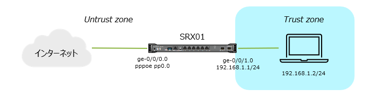 図のような環境で SRX を用いて PPPoE 接続を行い、Trust Zone からインターネットにアクセスする設定。
