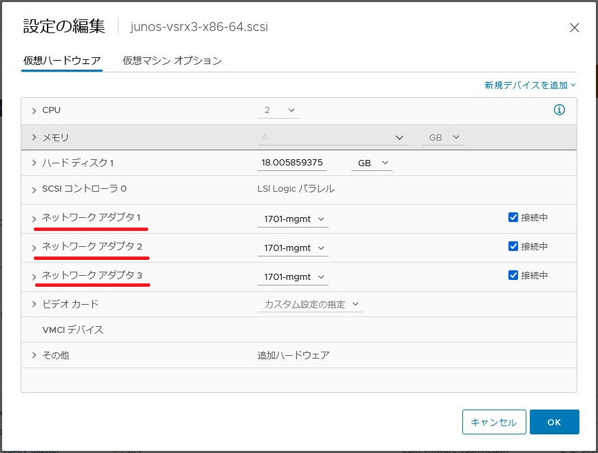 デフォルトで 3 つのネットワークアダプタが設定されます。必要に応じて追加します。