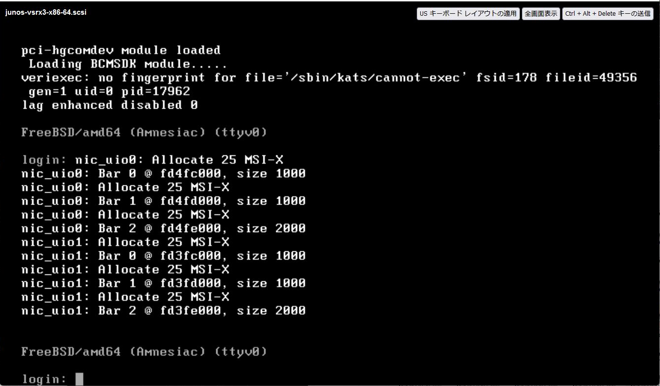 起動するとログインプロンプトになります。root、パスワードなしでログインできます。
